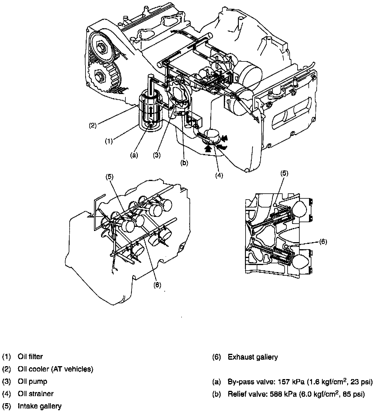- Engine oil discharged from oil pump is delivered to the journal bearings, connecting rod bearings, etc., via the oil passage (on the lower right side of the cylinder block), oil filter, and the oil gallery (on the right of the cylinder block) to provide proper lubrication and cooling.