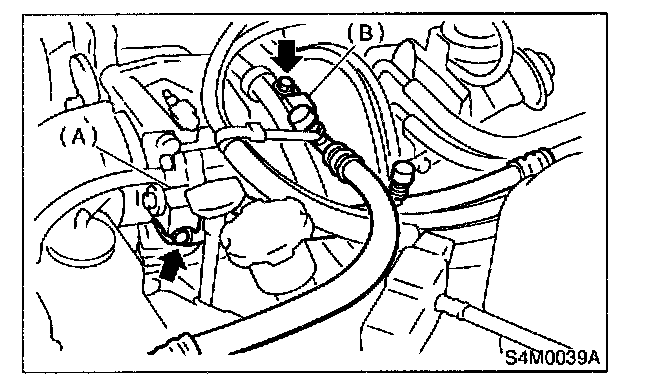 3. Remove low-pressure hose (A) (Flexible hose Ps) and high-pressure hose (B) (Flexible hose Pd).