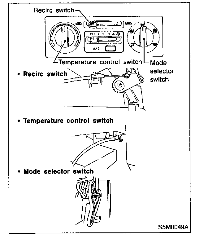 3. Disconnect temperature control cable and mode door control cable from heater unit then disconnect recirc control cable from intake unit.
