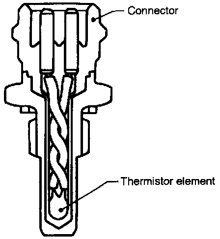 ENGINE COOLANT TEMPERATURE SENSORThe engine coolant temperature sensor is located on the engine coolant pipe which is made of aluminum alloy. Its thermistor changes resistance with respect to temperature. A engine coolant temperature signal converted into resistance is transmitted to the ECM to control the amount of fuel injection, ignition timing, etc.
