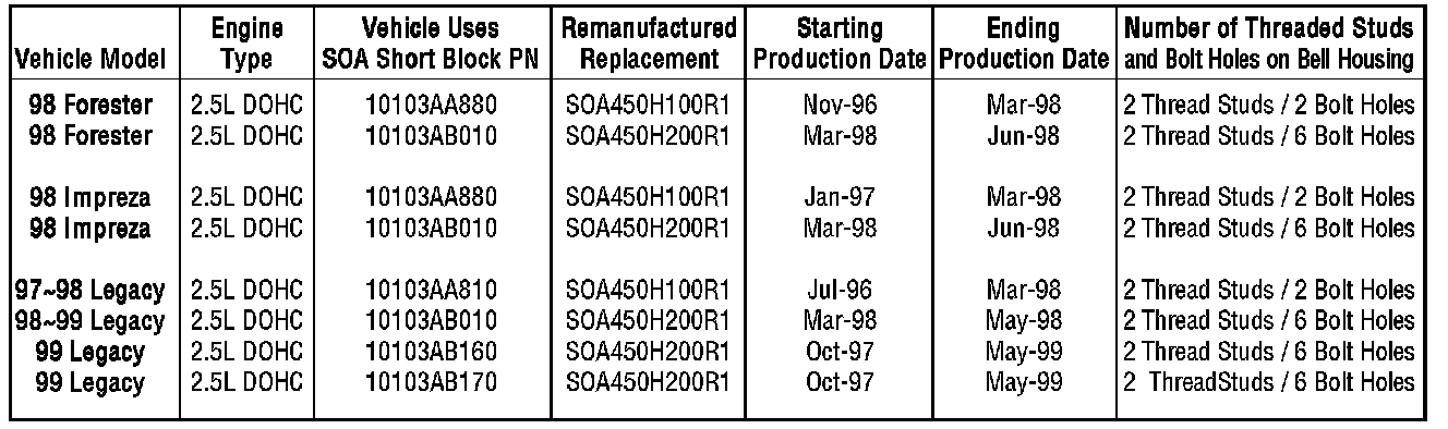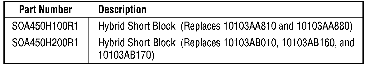 Subaru of America, Inc, is making available remanufactured hybrid short blocks for use in engine repairs when the original equipment short block must be replaced. These hybrid short blocks include oil pans, water pumps, thermostats, thermostat housings, and oil pumps. When compared with conventional repairs using an original equipment replacement short block, a new water pump, and new oil pump; these hybrid short blocks provide significant savings to customers. These Hybrid Engine Short blocks are factory tested for peak performance. Each hybrid short block is covered by the Genuine Subaru Remanufactured Engine Limited Warranty for 3-year or 36,000 mile from the date and mileage of installation (whichever occurs first); the Limited Warranty for Genuine Subaru Replacement Parts, or the balance of the Subaru New Vehicle Limited Warranties (when installed by a Subaru dealer) whichever is applicable.