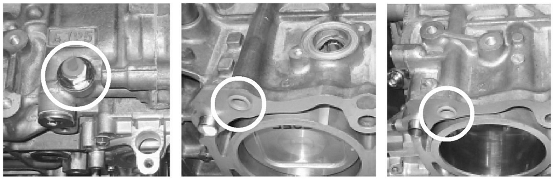 Be sure to remove the three plastic transit plugs (see images shown) prior to installation. One is located in the oil pressure switch plug. The others are in the main oil gallery ports that feed each head.