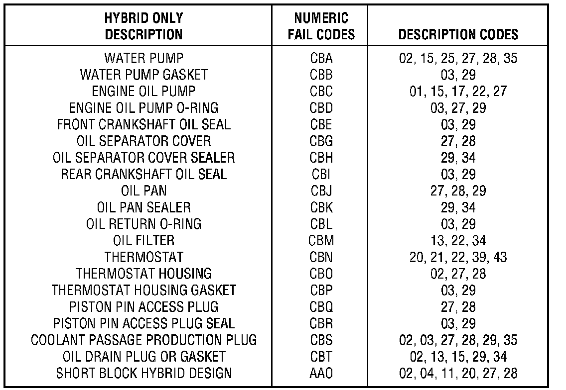 The configuration of the hybrid short block requires some component transfer depending upon the existing engine configuration. Any transferred components should be inspected and replaced if necessary.