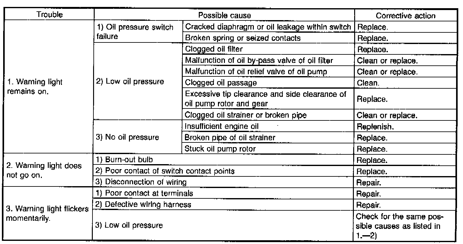 Before troubleshooting, make sure that the engine oil level is correct and no oil leakage exists.