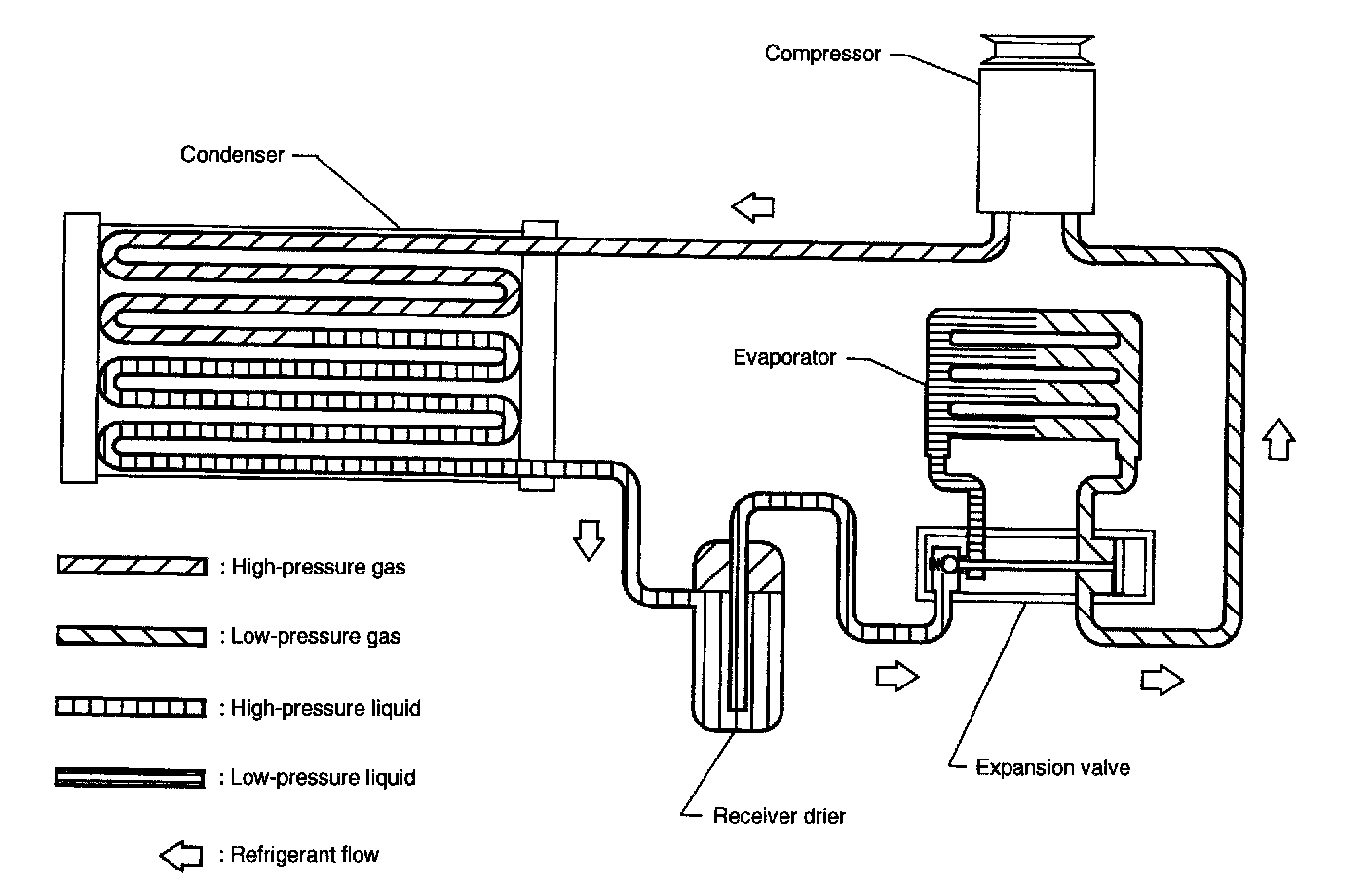 The refrigerant flows in the standard pattern, that is, through the compressor, the condenser, the receiver drier, through the evaporator, and back to the compressor.