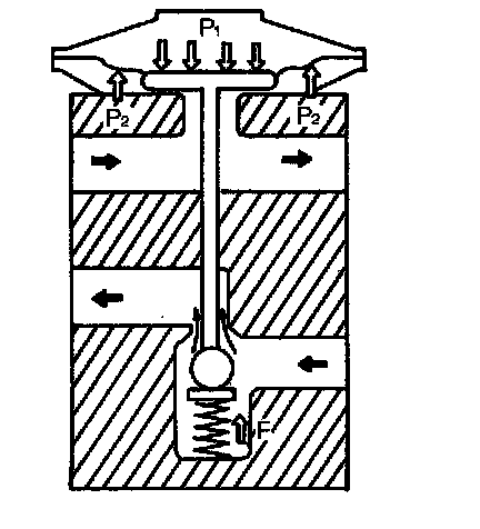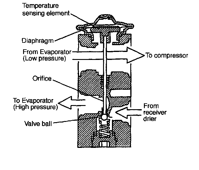If the heat load of the air conditioner system increases, the refrigerant temperature at the evaporator outlet rises and therefore increases the pressure P1 at around the temperature sensing area. As this pressure P1 becomes higher than the resultant force of evaporator outlet (low pressure side) pressure P2 and the spring force F (P1 > P2 + F), the diaphragm is pressed down, opening the valve ball connected to the diaphragm to increase the flow of the refrigerant.