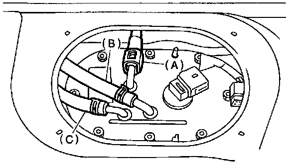 5) Move clips, and then disconnect fuel delivery hose (A), return hose (B) and jet pump hose (C).