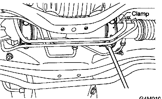 7. Remove one pipe joint at the center of gearbox, and connect vinyl hose to pipe and joint. Discharge fluid by turning steering wheel fully clockwise and counterclockwise. Discharge fluid similarly from the other pipe.