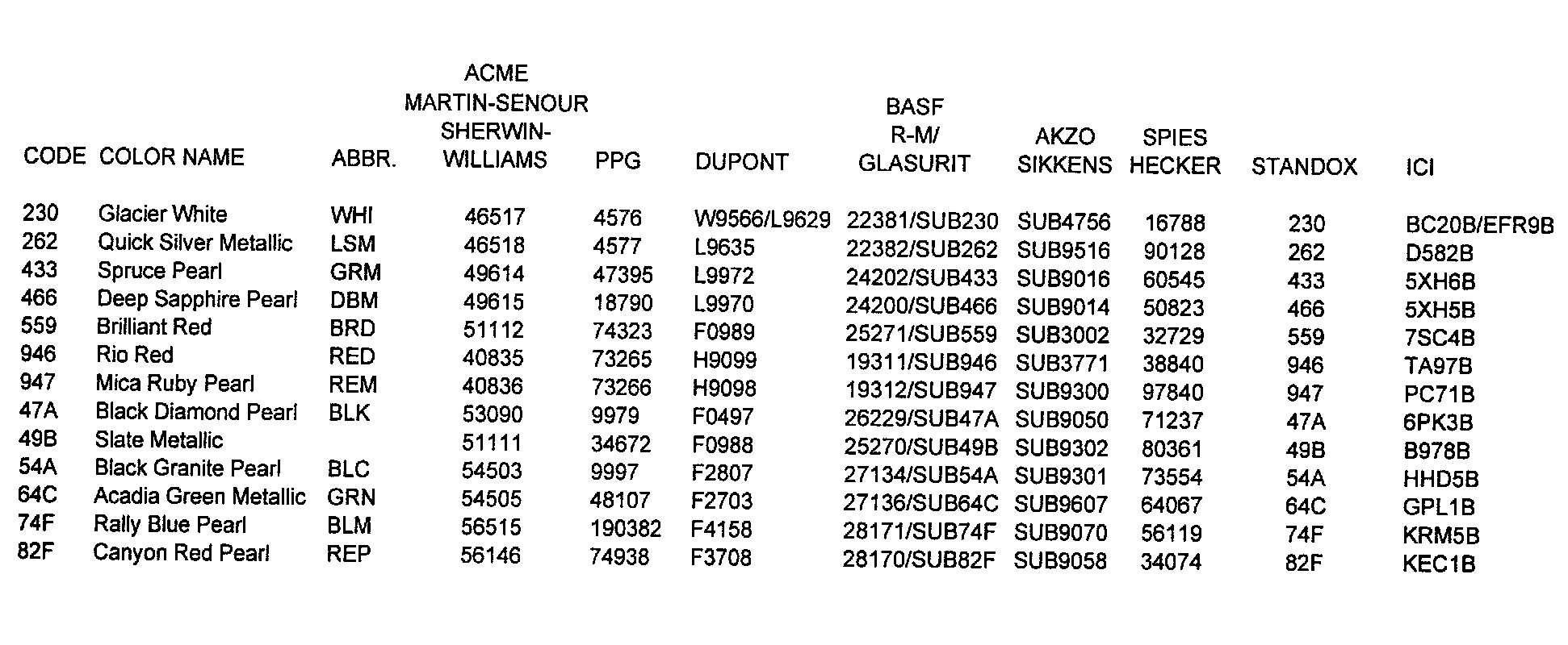 PAINT CODES AND COLOR NAMES