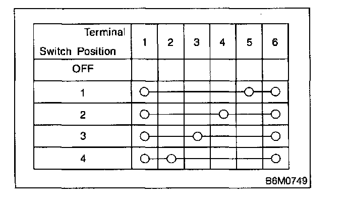 3. Symbol in the table indicates that continuity exists between two points or terminals. For example, when a switch position is "3", continuity exists among terminals 1, 3 and 6, as shown in table.