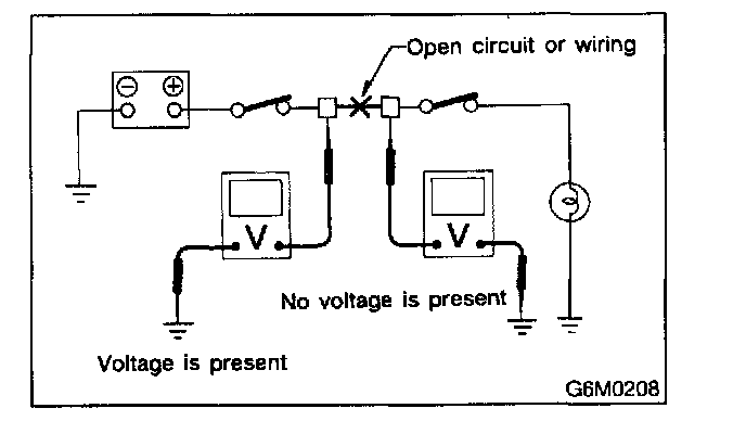 An open circuit is determined by measuring the voltage between respective connectors and ground using a voltmeter, starting with the connector closest to the power supply. The power supply must be turned ON so that current flows in the circuit. If voltage is not present between a particular connector and ground, the circuit between that connector and the previous connector is open.