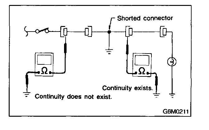 Disconnect all affected connectors, and check continuity between each connector and ground. When ohmmeter indicates continuity between a particular connector and ground, that connector is shorted.