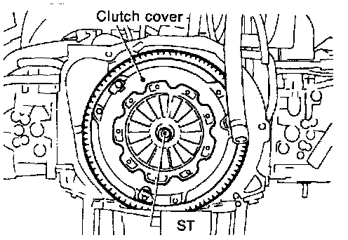 - Tighten clutch cover installing bolts gradually. Each bolt should be tightened to the specified torque in a crisscross fashion.