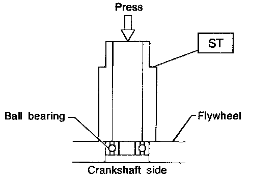 2. Press bearing into flywheel until bearing end surface is flush with clutch disc contact surface of flywheel. Do not press inner race.