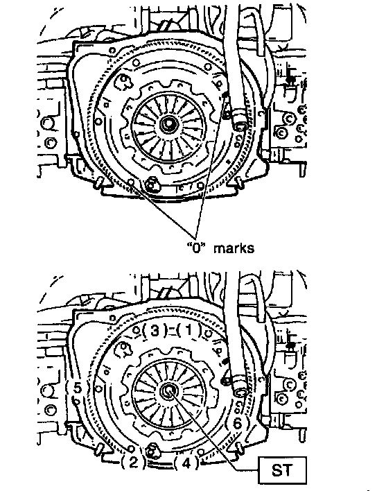 - When installing the clutch cover on the flywheel, position the clutch cover so that there is a gap of 120° or more between "0" marks on the flywheel and clutch cover. ("0" marks indicate the directions of residual unbalance.)