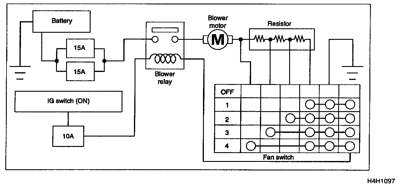Blower SystemOperation of the blower relay is controlled by turning ON and OFF the ignition switch. When the ignition switch is ON and the fan switch is operated from 1st to 4th speed, electric current from the battery goes through the blower motor, the resistor, the fan switch and ground. The resistor is switched by the position of the fan switch, and controls the blower motor speed from 1st to 4th.