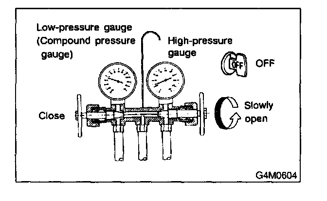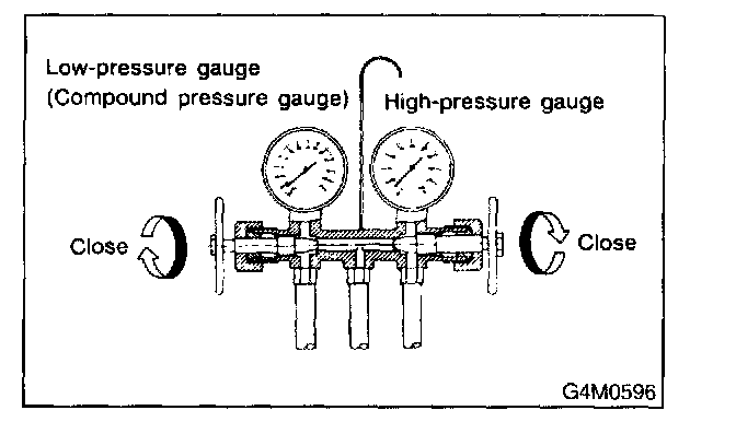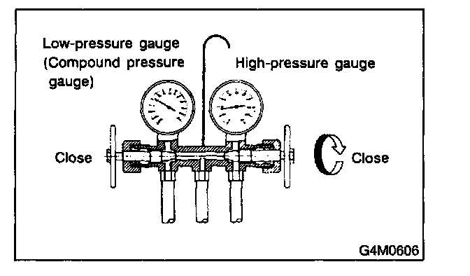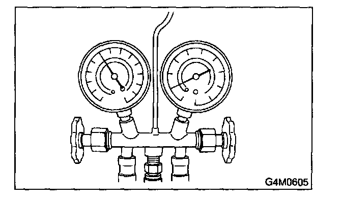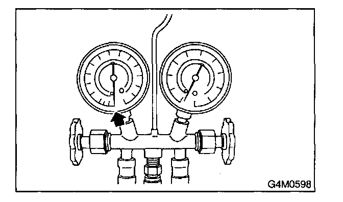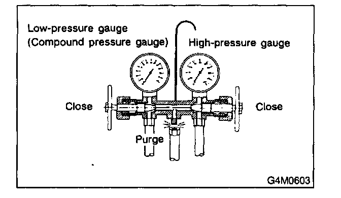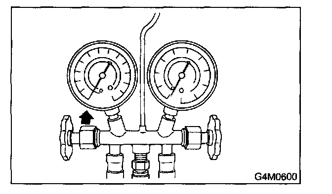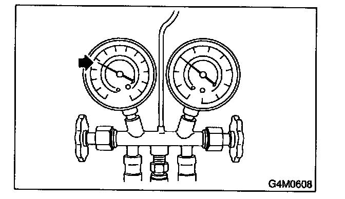 2. Attach the low-pressure manifold hose to the low-pressure service port on the vehicle. Check the low-pressure gauge. If more than 68.6 kPa (0.70 kg/sq.cm, 10 psi) is indicated, discharge the system prior to charging.