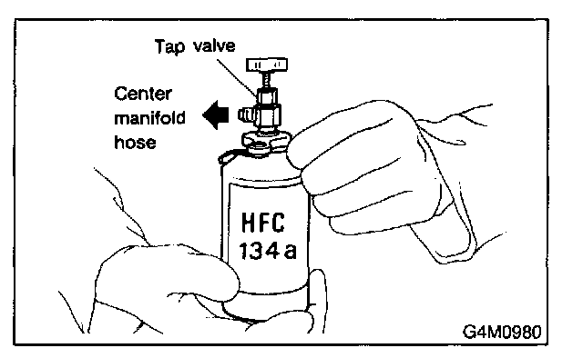 If the HFC-134a source is exhausted, first close the high- pressure manifold valve, second, close the can tap valve, then slowly purge the refrigerant from the service hose by loosening the fitting at the can tap.