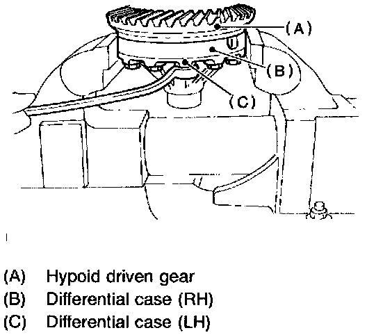 2. Install the washer and differential bevel gear to the differential case (LH). Then put the case over the differential case (RH), and connect both cases.