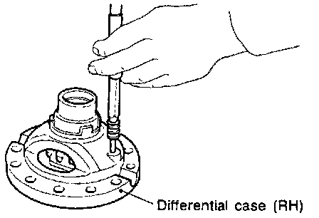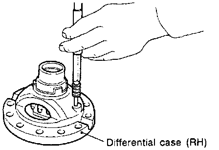 1. Install the washer, differential bevel gear and differential bevel pinion in the differential case (RH). Insert the pinion shaft, and fit the straight pin.