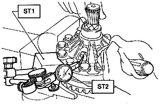 4. Measurement of backlash (Selection of washer) Measure the gear backlash with ST1 and ST2, and insert ST2 through the access window of the case.