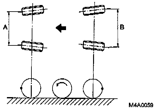b. Mark rear sides of left and right tires at height corresponding to center of spindles and measure distance "B" between marks.