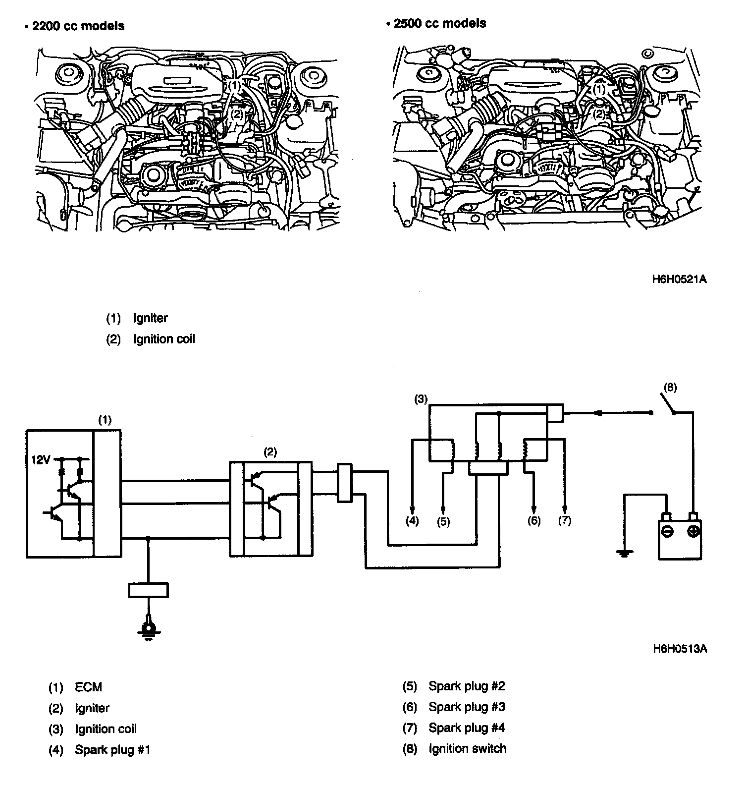 The ignition system is of a 2-cylinder simultaneous ignition design. In response to the signal from the ECM, the igniter supplies another signal to the ignition coil to ignite a pair of cylinders #1 and #2 or #3 and #4 simultaneously.