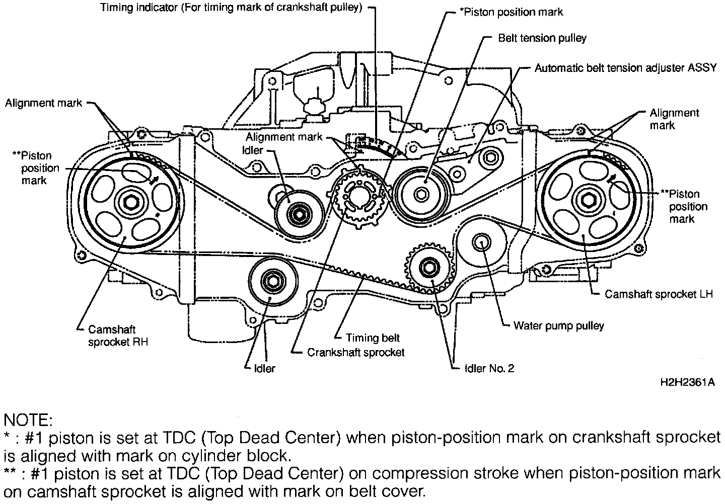 ^ **:#1 piston is set at TDC (Top Dead Center) on compression stroke when piston-position mark on camshaft sprocket is aligned with mark on belt cover.
