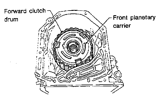 19. Install the front planetary carrier. Attach the thrust needle bearings to both sides of the carrier with vaseline. Install the carrier carefully, while aligning with the splines of the forward clutch drum, and while rotating the pinion.