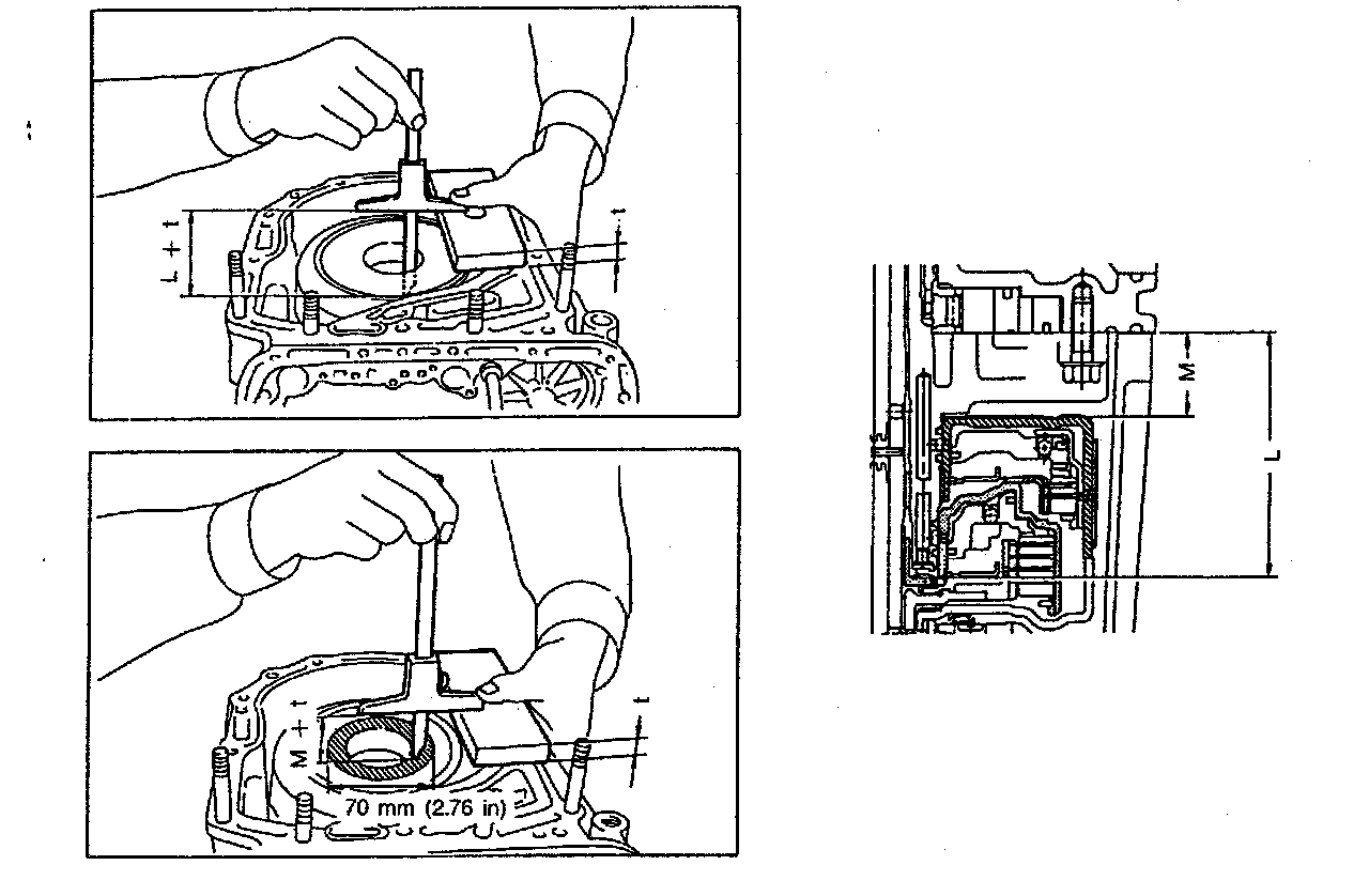 1. Measure the distance from the transmission case mating surface to the recessed portion of the high clutch drum "L", and the distance to the top surface of the reverse clutch drum "M".