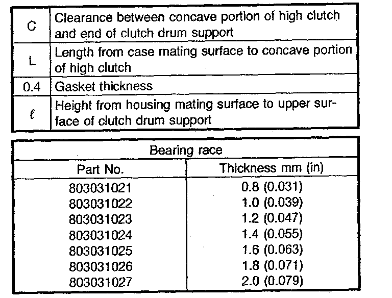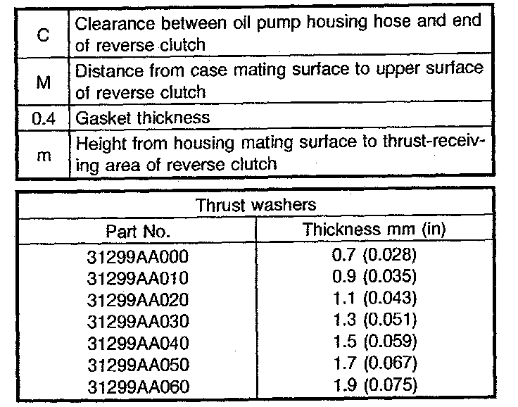 - Reverse clutch end play Select suitable thrust washer from among those listed in this table so that clearance C is in the 0.55 - 0.90 mm (0.0217 - 0.0354 inch) range.