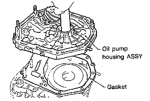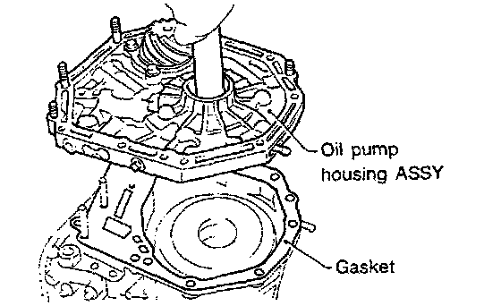 2. After correctly installing the gasket to the case mating surface, carefully install the oil pump housing assembly. Be careful to avoid hitting the drive pinion against the inside of the case.