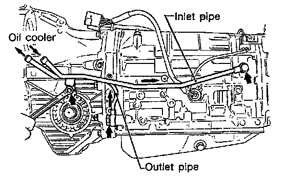 6. Install the oil cooler outlet pipe, and secure with two bolts.
