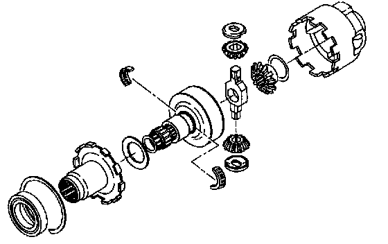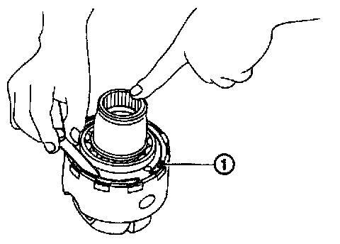 1. After assembling, using a thickness gauge measure clearance between snap ring (1) and center differential case.