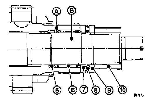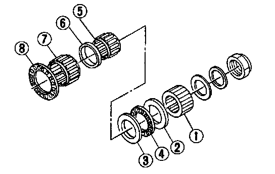 Remove differential bevel gear sleeve (I), adjusting washer No. 1 (2) (25 x'37.5 x t), adjusting washer No. 2 4) (25 x 37.5 x 4), thrust bearing (4) (25 x 37.5 x 3), needle bearing (5) (25 x 30 x 20), drive pinion collar (6) , needle bearing (7) (30 x 37 x 23) and thrust bearing (0) (33 x 50 x 3).