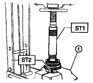 1. Install roller bearing onto drive pinion. Install washer 1) (33 x 50 x 5) using ST1, ST2 and press.