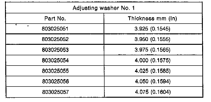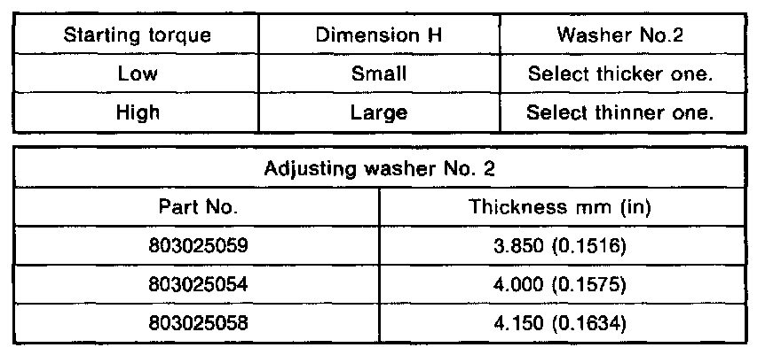 5. If specified starting torque range cannot be obtained when a No. 1 (2) adjusting washer is used, then select a suitable No. 2 1 adjusting washer from those listed in the following table. Repeat steps 1) through 4) to adjust starting torque.