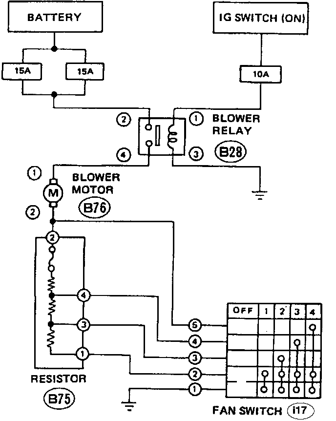 Blower SystemOperation of the blower relay is controlled by turning ON and OFF the ignition switch. When the ignition switch is ON and the fan switch is operated from 1st to 4th speed, electric current from the battery goes through the blower motor, the resistor, the fan switch and ground. The resistor is switched by the position of the fan switch, and controls the blower motor speed from 1st to 4th.