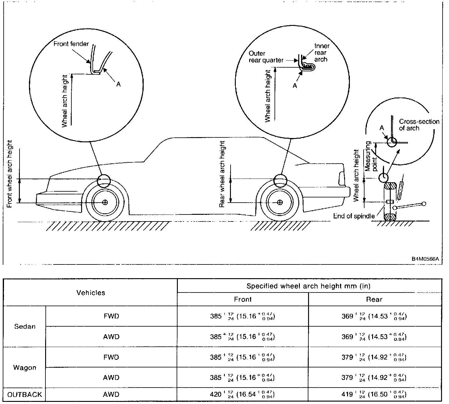 2. Mark rear sides of left and right tires at height corresponding to center of spindles and measure distance "B" between marks.