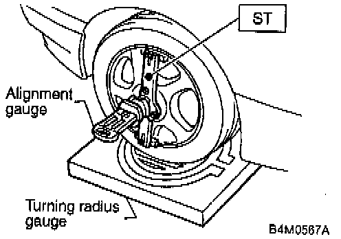 2. Set ST into the center of the wheel, and then install the wheel alignment gauge.