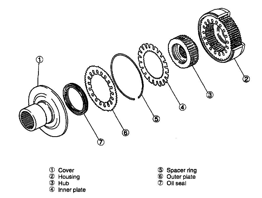 A mixture of silicone oil and air is sealed in the space inside the viscous coupling housing. An "X" seal ring prevents silicone oil from entering the transmission. This could occur when silicone oil is highly pressurized due to an increase in rotating speed difference between the front and rear wheels.