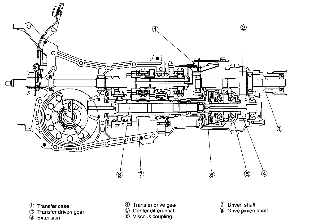 In addition, the viscous-coupling serves as a differential-action control to eliminate a mechanical lock mechanism. The major parts, such as the main case, mainshaft, front differential, the same types as those used with the transmission that provides Front-Wheel Drive (FWD) for standardization purpose.