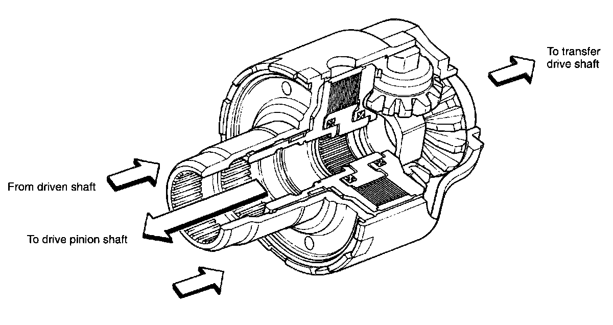 When the front and/or rear wheels spin on muddy roads, etc., viscous coupling controls the differential action so that the optimum drive torque is automatically distributed to these wheels.