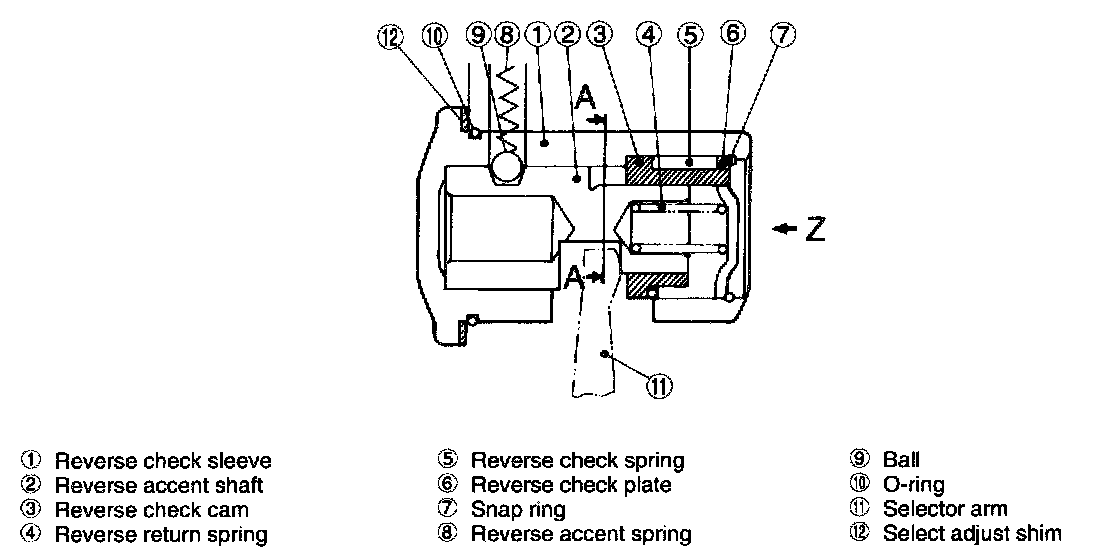 From the position shown in figure [Section A-A]-(1), the arm (11) again moves to the 5th and reverse side. When the shift is made to reverse, the arm (11) moves to the reverse position while pushing the shaft (2) and cam (3) together.