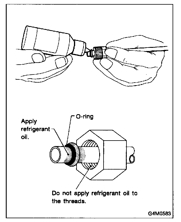 For lubrication of the components, use apprpriate refrigerant oil. Apply oil from an oil squirt gun or other closed container. Do not use your finger to spread the oil over the O-ring. Apply a small amount of refrigerant oil to the top and sides of the O-ring. The area covered by oil should include the O-ring and the tube bead.