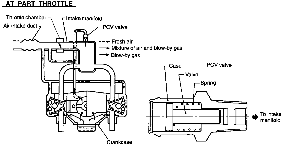 - At the part throttle, the blow-by gas in the crankcase flows into the intake manifold through the connecting hose of crankcase and PCV valve by the strong vacuum of the intake manifold. Under this condition, the fresh air is introduced into the crankcase through connecting hose of rocker cover.
