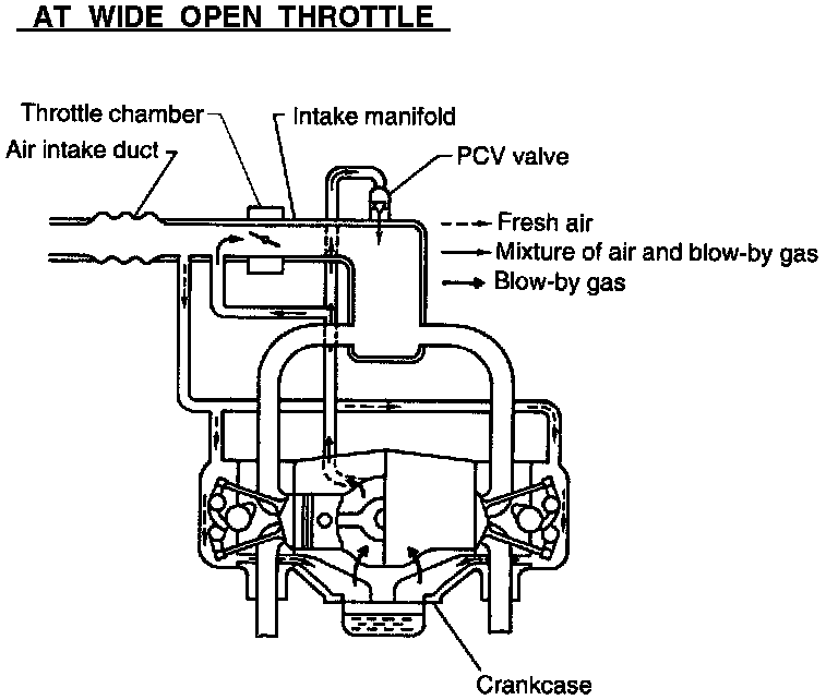 - At wide open throttle, a part of blow-by gas flows into the air intake duct through the connecting hose and is drawn to the throttle chamber, because under this is condition, the intake manifold vacuum is not so strong as to introduce all blow-by gases increasing with engine speed directly through the PCV valve.