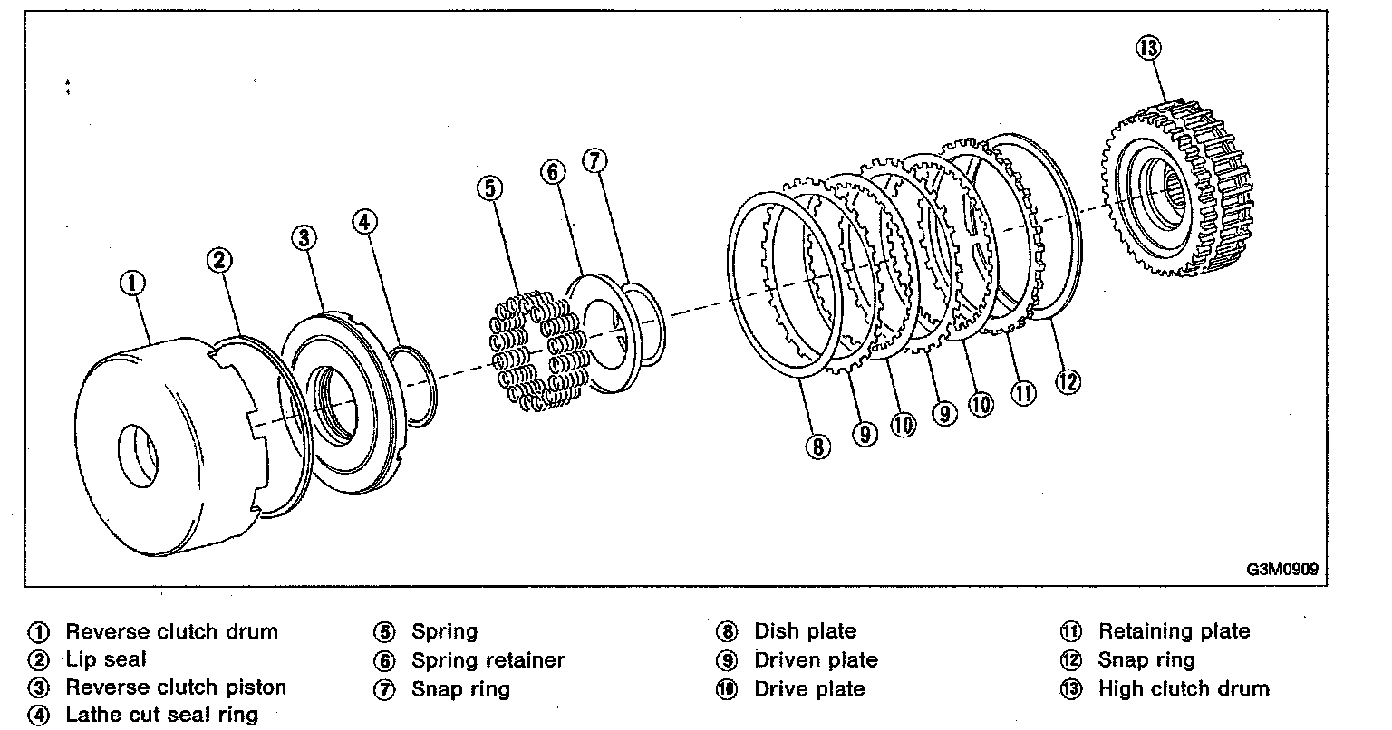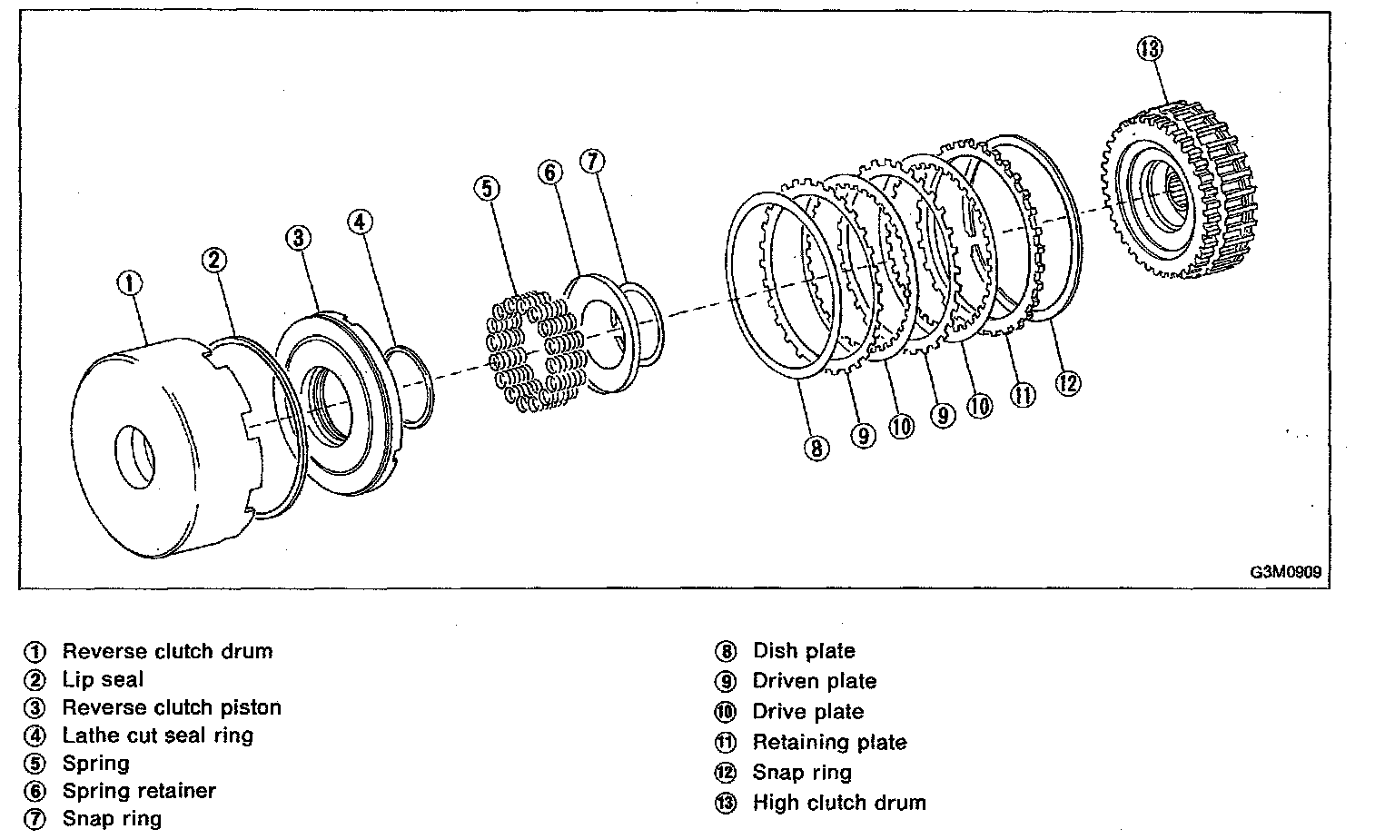 A: DISASSEMBLY1. Remove the snap ring (12), and take out the retaining plate (11), drive plates (10), driven plates (9), and dish plate (8).