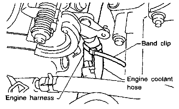3) Remove band clip which fastens engine harness to engine coolant hose.