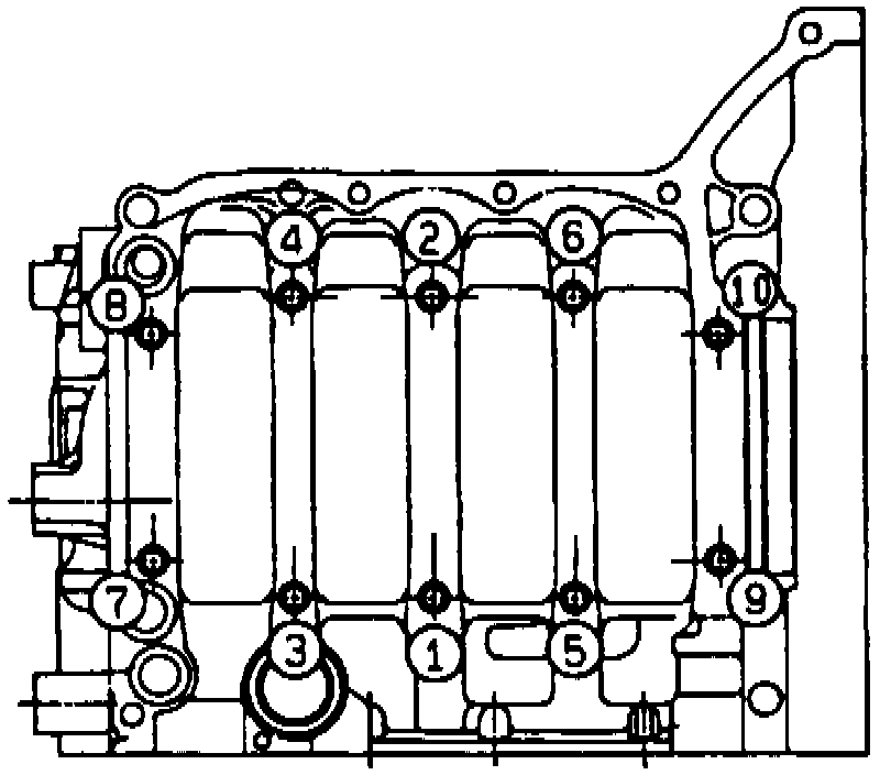 3) Tighten 10 mm cylinder block connecting bolts in numerical order.